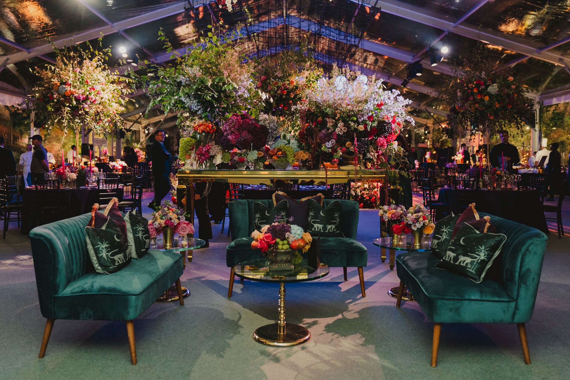 We dashed to the glass marquee to check on the final bits of transformation. The marquee was now the host to a collection of lounge areas, grandiose luxurious urns overflowing with flowers and fruits, tables and a bar all in jewel tones.
