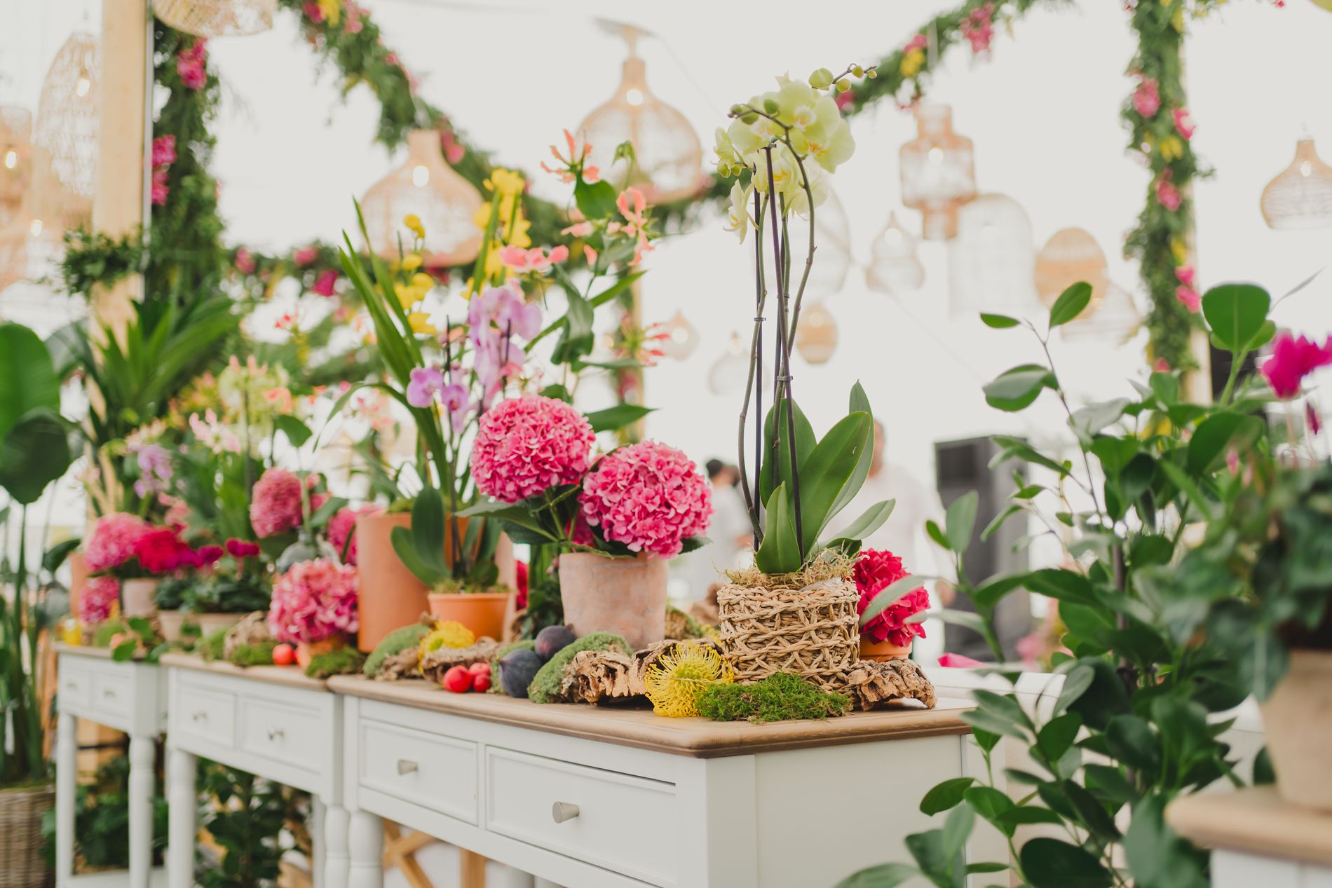 The interior was decorated with hanging woven lamps, garlands of greenery and bursts of tropical flowers.