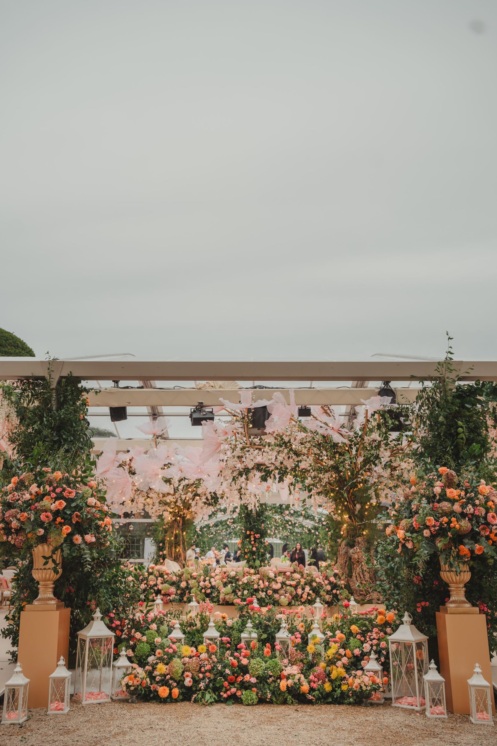 This sacred space for the Hindu wedding ceremony was a true showstopper. With ceilings draped in silks, layered with soft-toned florals, and framed by a pair of bespoke metalwork trees and oversized tulle pink flowers.